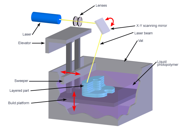 The SLA printer uses galvanometers, also called galvos, where one is positioned on the X-axis and the other on the Y-axis. These galvanometers aim at the point of a laser beam across the resin vessel, selectively curing and solidifying it by a cross-section of the object in the build area, building it up layer by layer for convenience.